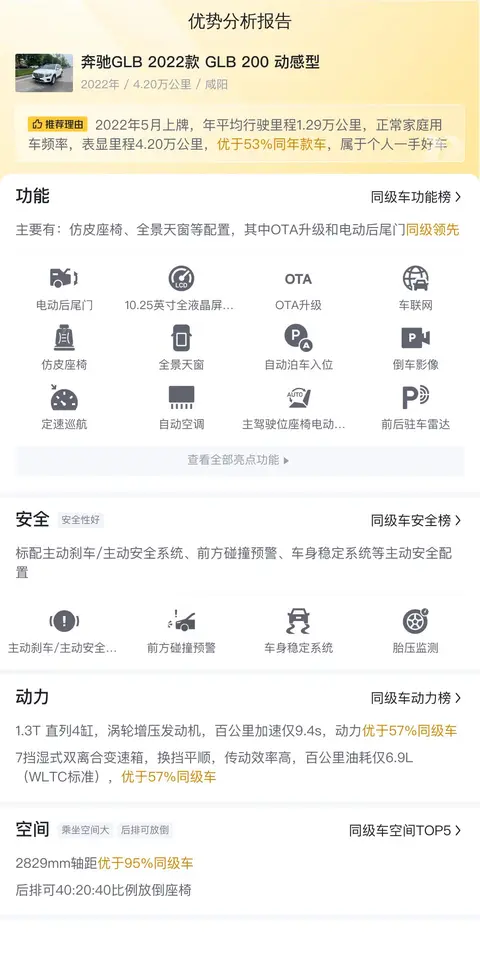这辆奔驰GLB 2022款 GLB 200 动感型优点是空间大,尤其是后备厢空间,适合带娃家庭使用,豪华品牌调性比较高,开出去有面子,配置丰富,尤其是安全性配置,同级别很少见。缺点是动力一般,起步较肉,与同级别2.0T的发动机相比,稍微逊色一些,与之匹配的7挡湿式双离合变速箱在低档位升降档的时候会有顿挫感,影响驾驶体验。