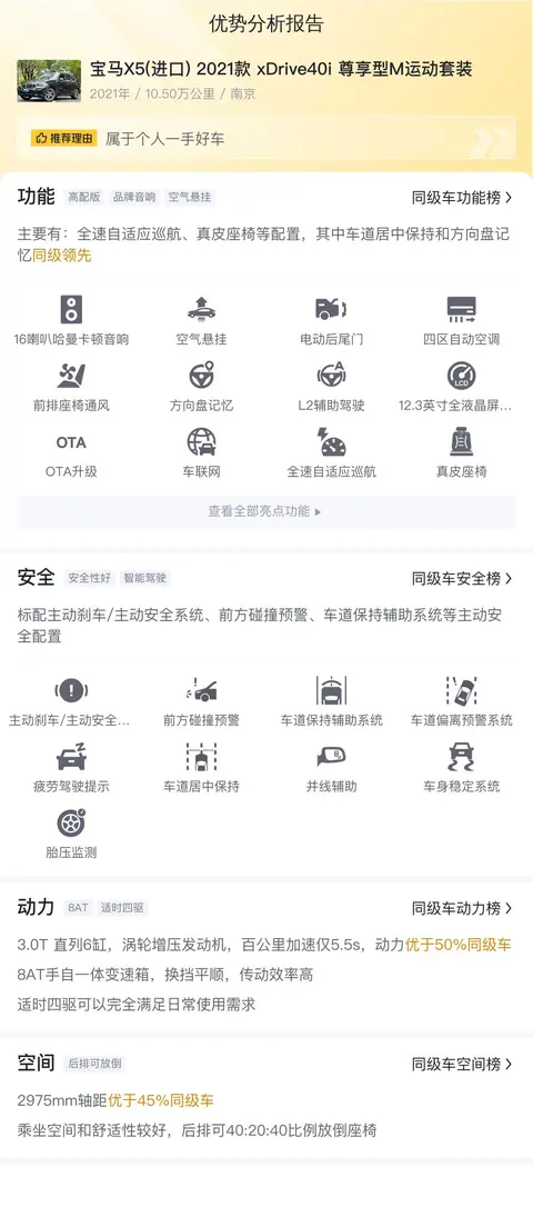 这台宝马X5装配了全速自适应巡航、可开启全景天窗、真皮座椅以及哈曼卡顿音响等一系列高端配置,无疑为驾乘者营造出了一个集舒适与便捷于一体的车厢环境。值得一提的是,其方向盘记忆和前排座椅通风功能更是同级别中的佼佼者,无论是长途旅行还是日常通勤都能提供最佳的乘坐体验。