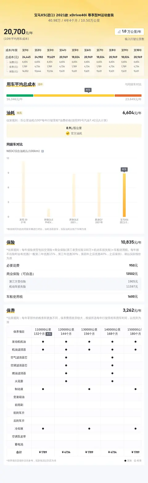 二手车市场的水有时深不可测,但根据懂车帝的大数据分析,这台宝马X5(进口) 2021款 xDrive40i 尊享型M运动套装的车况良好,行驶里程适中,在二手车市场上,它的售价在37.7万至46.45万之间较为合理。当然,最终的成交价还需综合考虑车辆的实际状况、维护记录以及市场供需等多种因素。至于用车成本方面,根据估算,该车的年均综合用车成本大约为2.1万元左右,这一数字在同级别车型中属于相当合理的范畴。