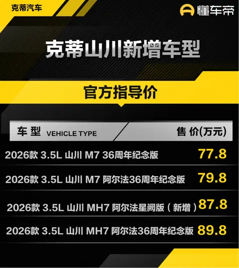 [懂车帝原创 产品] 日前,克蒂山川(图片|配置|询价)新增MH7阿尔法星阙版上市,指导价格为87.8万元起。新车定位于中大型MPV,采用7座布局,搭载3.5升V6自然吸气发动机。