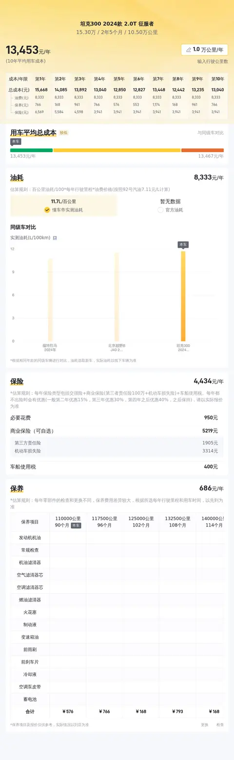 不过据估算,同级车的最低用车成本是12700元/年,最高是16375元/年,坦克300 2024款 2.0T 征服者是13330元/年,所以用车成本适中。