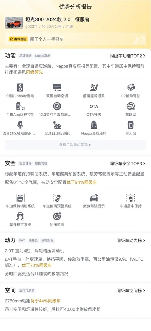 综合来看,这款坦克300的实用性和舒适性都不错,外观帅气,内饰豪华,空间宽敞,是一款值得考虑的二手车。如果你正在寻找一款既能满足日常出行需求,又能在周末带你去野外撒野的车型,那么这款坦克300无疑是一个不错的选择。不过,具体车况还需要实地检验,确保车辆没有重大事故或维修记录。