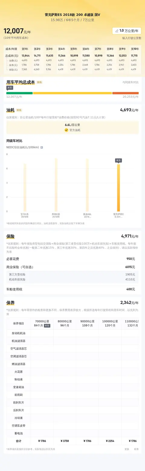 雷克萨斯ES 2018款 200 卓越版 国V的10年平均用车成本估算为12,185元/年,这一成本在同类车型中处于相对合理的范围内。然而,实际用车成本可能会因多种因素而有所变动,包括车主的驾驶习惯、车辆的维护状况、油价波动以及保险费用的变化等。此外,随着车辆使用年限的增加,可能需要更多的维护和修理工作,这也可能会增加用车成本。因此,潜在车主在考虑购买时,应全面评估自己的用车需求、预算以及对车辆性能和品质的期望,以做出最适合自己的决策。