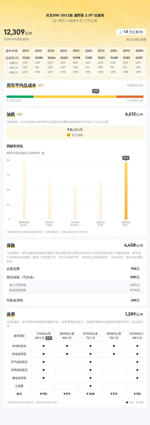 据估算,同级车的最低用车成本是5335元/年,最高是12471元/年,坦克300 2021款 越野版 2.0T 征服者是12471元/年,所以用车成本较高。