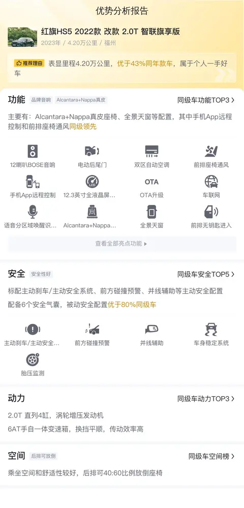 另外,同级车的最低10年平均用车成本是6977元/年,最高是14393元/年,红旗HS5 2022款 改款 2.0T 智联旗享版是12336元/年,是适中的水准,但和同价位油车相比,动力更强,行驶成本更低。