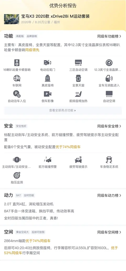 购买这类二手车时,建议消费者关注车辆的实际状况,包括车况、行驶里程、过户次数等,并尽可能选择信誉好的卖家或经销商。同时,也可以咨询专业的二手车评估机构,对车辆进行详细的检测和评估,以确保所购车辆的价值和质量。对于这辆宝马X3 2020款 xDrive28i M运动套装而言,其合理的售价、丰富的配置和良好的市场口碑,都使其成为了一个值得考虑的选择。但同时也需要注意,由于其较高的动力输出和四驱系统的存在,燃油消耗可能会相对较大;而且作为一款豪华品牌车型,其后期维修保养成本也可能较高。因此,在做出购买决定之前,消费者应该充分权衡自身需求和经济实力,做出最适合自己的选择。
