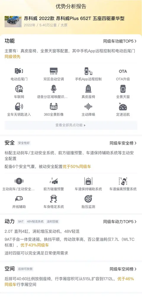 综上所述的新车含税价、用车成本、市场行情、优势分析、同款比价等数据仅供参考。在配置部分,因为二手车非标品,车辆可能会存在配置改装的情况,具体车况信息需要线下结合车辆实际情况进行综合参考。