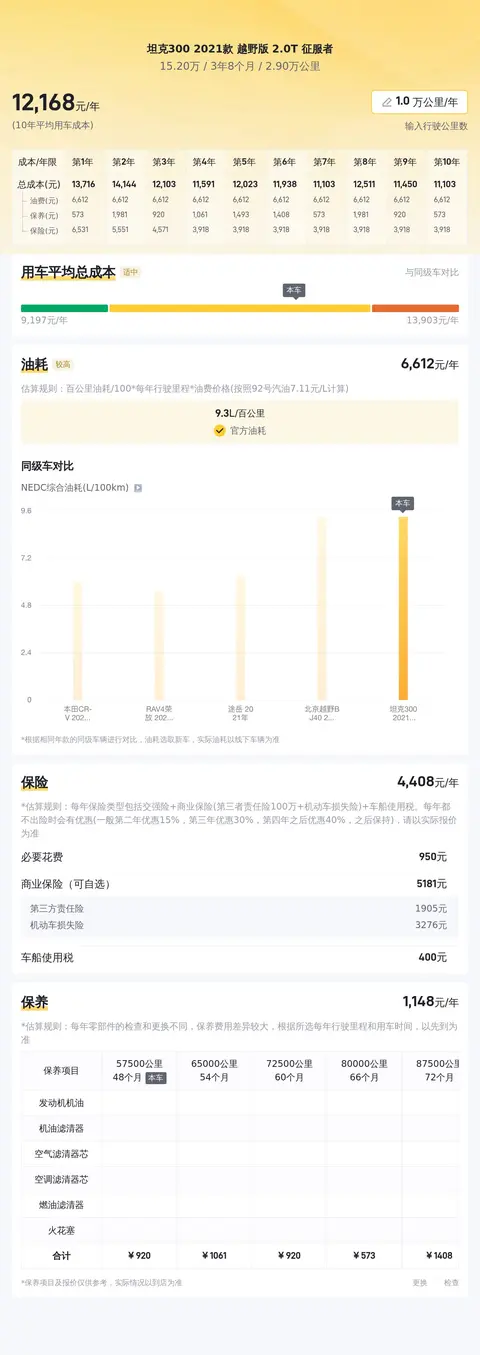 据估算,同级车的最低用车成本是6506元/年,最高是12220元/年,坦克300 2021款 越野版 征服者是12220元/年,所以用车成本也较高。