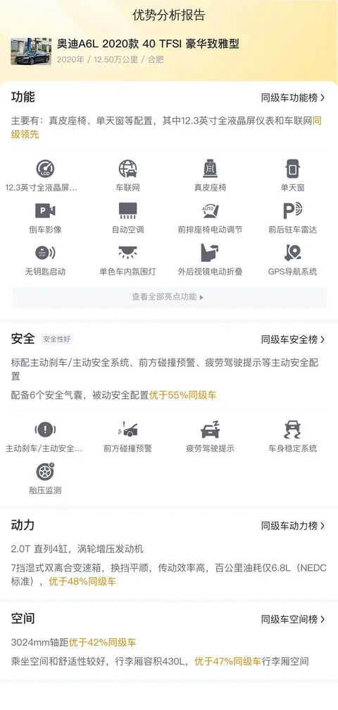 综上所述,奥迪A6L 2020款 40 TFSI豪华致雅型的配置还算丰富,动力强劲,空间宽敞,内饰高级,同时价格又比较实惠,用车成本较低,是一款性价比较高的车。不足之处就是车龄略高,里程值也偏长,但不影响使用,也不妨碍魅力的发挥。总的来说,还是挺适合捡漏的。