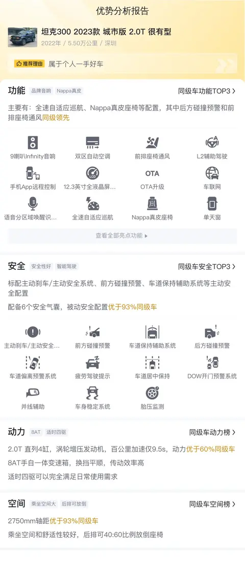 在竞争对比方面,坦克300 2023款 城市版 2.0T 很有型在动力性能、车身尺寸、配置丰富度以及越野能力等方面都表现出色。与同级别车型相比,它在保持城市SUV舒适性和实用性的同时,还具备了出色的越野性能和通过性。当然,每款车型都有其自身的特点和优势,消费者在选择时还需要根据自己的实际需求和预算进行综合考虑。