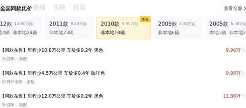 发现 2010款 3.0TDV6 HSE 柴油版,新车含税价为87.13万,现在的二手车报价是12.8万,2010年7月首次上牌,在此期间过户1次。