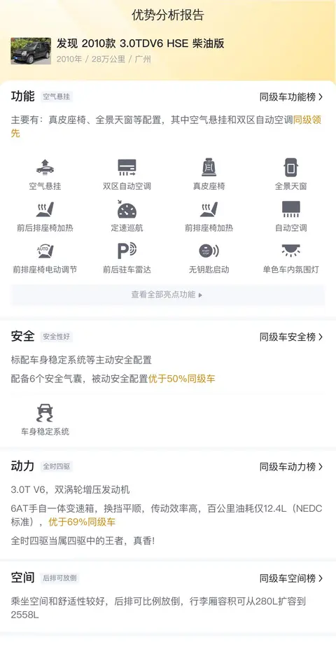 据估算,发现 2010款 3.0TDV6 HSE 柴油版的用车成本是22133元/年,同级车最低是19178元/年,最高是46726元/年,它的用车成本适中,整体开销不大。