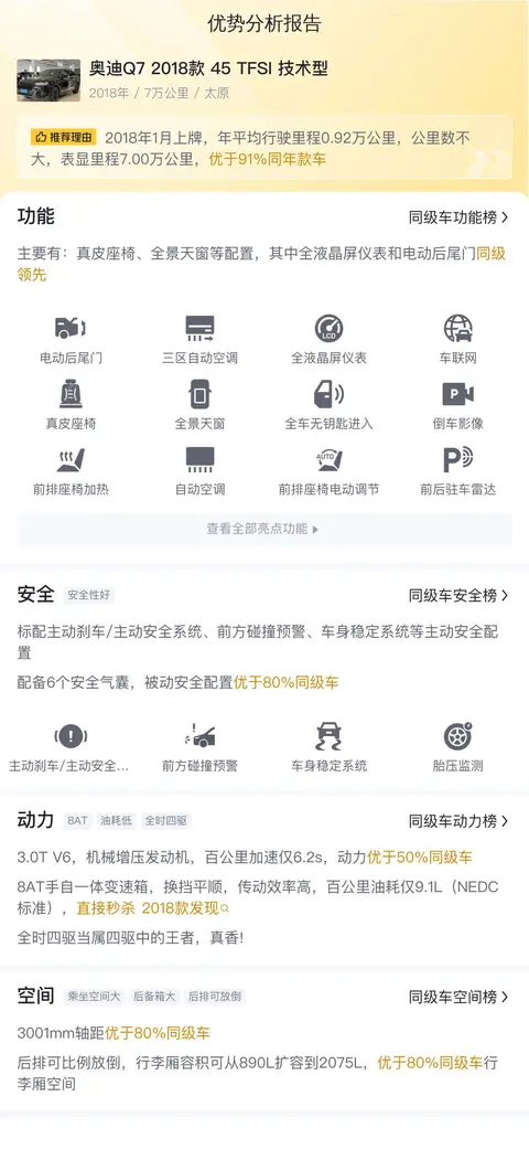 综上所述,奥迪Q7 2018款 45 TFSI 技术型是一辆品牌和档次都在线的中大型SUV,适合那些需要宽敞空间、高品质生活,并且经常长途自驾游的个人或家庭用户,而那些对用车经济性较为敏感的朋友则需要谨慎选择。