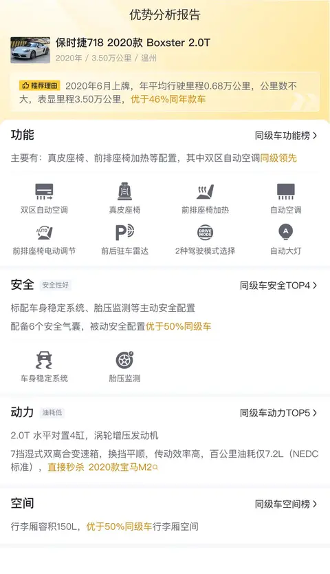 先介绍一下这辆车的基本信息,该车的具体版本是——保时捷718 2020款 Boxster 2.0T,表现里程3.5万公里,上牌日期2020年6月,上牌地车源地均为温州,车身颜色为白色,过户次数1次。该车新车指导价56.5万,新车含税价61.63万,而现在的二手车报价为39.8万,相比新车省16.7万。