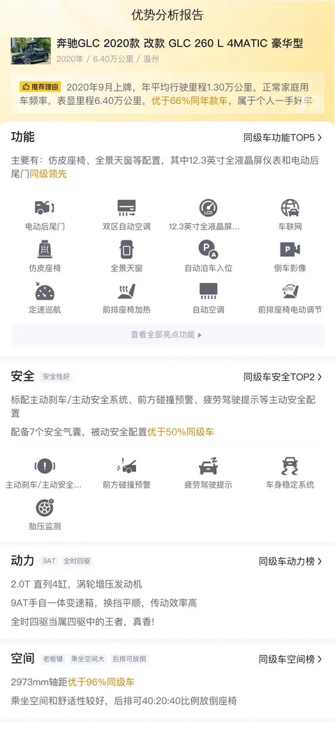 总结:这款奔驰GLC 2020款 改款 GLC 260 L 4MATIC 豪华型是一款豪华SUV,已经行驶了6.4万公里,没有过户记录。售价比新车便宜了23.08万,且比全国均值低,是一个不错的选择。这款车搭载了丰富的豪华配置和智能科技,提供了出色的舒适性和便利性。动力性能方面,它搭载了2.0T直列4缸涡轮增压发动机,具有197马力的最大功率和320N·m的峰值扭矩,匹配9AT手自一体变速箱,提供了平顺的换挡体验和高效的传动效率。车内空间宽敞,乘坐舒适,储物空间灵活。这款车在二手市场的热度较高,全国销量榜第2名,且近期价格稳定。这款车的用车成本较低,且保值率较高,是一个不错的选择。如果您正在寻找一款豪华SUV,那么这款车绝对值得您考虑。