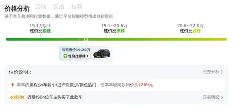 根据懂车帝的数据,这款车的售价区间为19.71-23.65万,而当前这辆车的售价为19.2万,低于全国均值,是一个不错的选择。这款车在二手市场的热度较高,全国销量榜第2名,且近期价格稳定。这款车的用车成本较低,且保值率较高,是一个不错的选择。