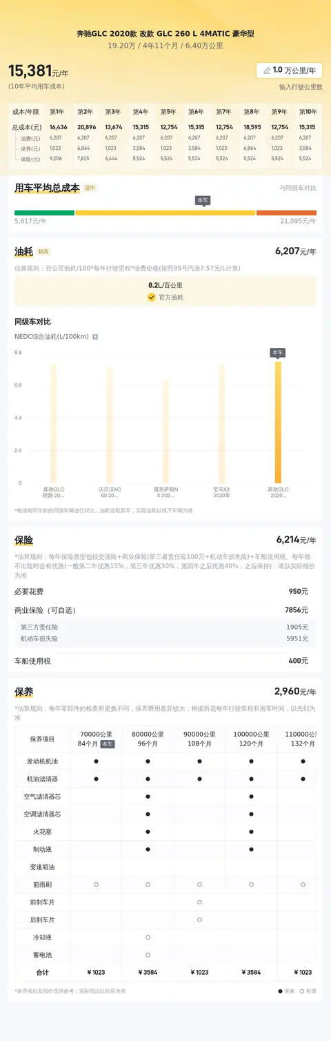 这款车的百公里油耗为8.2升,按照每年行驶2万公里计算,每年的油费约为13174元。这款车的保险费用大约为6538元/年,保养费用大约为3348元/年,这些费用都属于正常范围之内。总的来说,这款车的使用成本较低,是一个不错的选择。