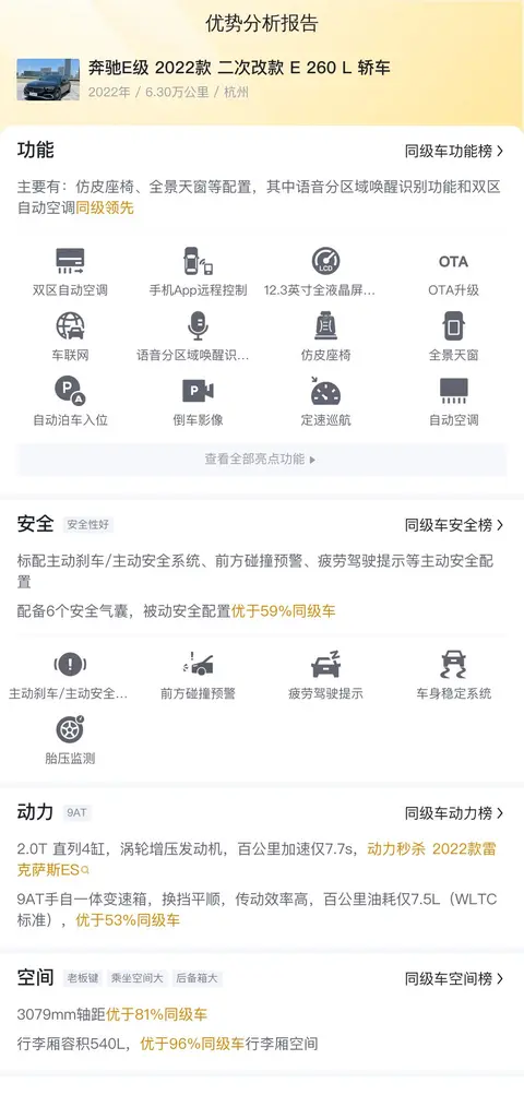 这款奔驰E级 2022款 二次改款 E 260 L 轿车在配置上比较一般,不过安全性不错,标配主动刹车/主动安全系统、前方碰撞预警、疲劳驾驶提示等主动安全配置,被动安全配置上配备7个安全气囊,使其被动安全配置优于89%同级车。