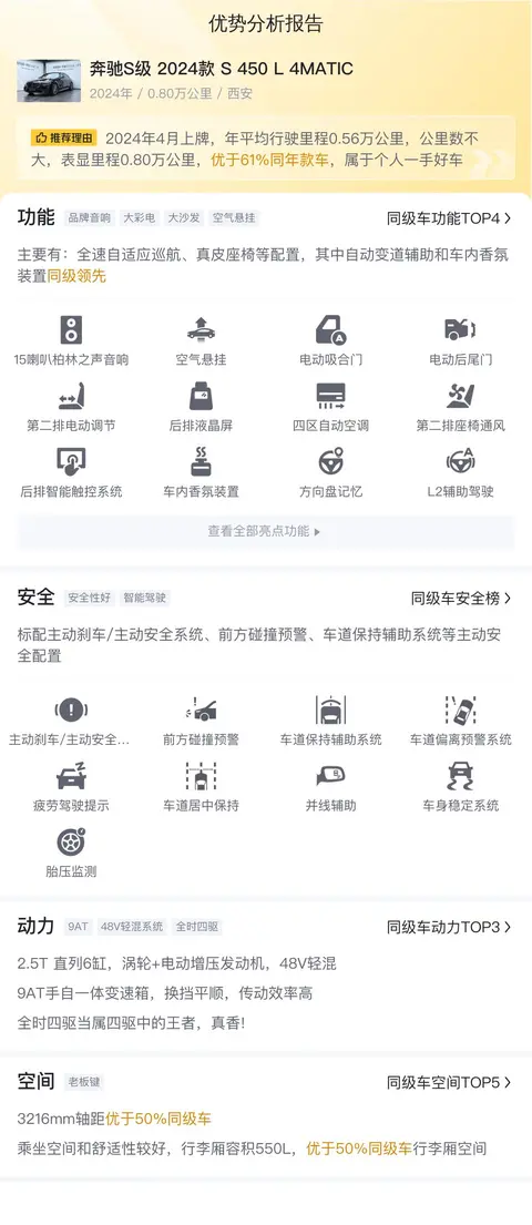 综上所述,这款二手奔驰S级 2024款 S 450 L 4MATIC可以说是一款集豪华、舒适、动力于一身的豪华轿车。无论是从外观还是内饰、配置还是动力性能等方面来看,它都表现出了非常出色的水平。如果你正在寻找一款豪华轿车作为自己的座驾,那么这款车绝对是一个不错的选择。但是需要注意的是,作为一款二手车,它的车况非常重要。在购买之前一定要进行仔细的检查和评估,以免出现不必要的麻烦。同时也要考虑到这款车的维护和保养成本相对较高,在购买之前要做好充分的心理准备。总之如果你有足够的预算并且对豪华轿车有着极高的追求那么这款车绝对值得你去拥有!