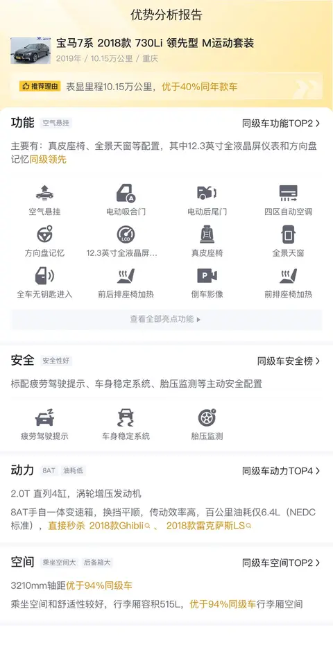 买二手车,配置要实用。宝马7系 2018款 730Li 领先型 M运动套装配备了真皮座椅、全景天窗等配置,其中12.3英寸全液晶屏仪表和方向盘记忆同级领先。