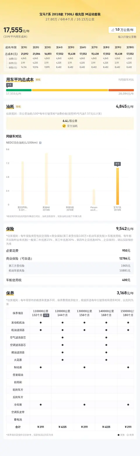 宝马7系 2018款 730Li 领先型 M运动套装的10年平均用车成本是18481元/年,同级车的最低10年平均用车成本是18481元/年,最高是40710元/年,所以它的用车成本较低。