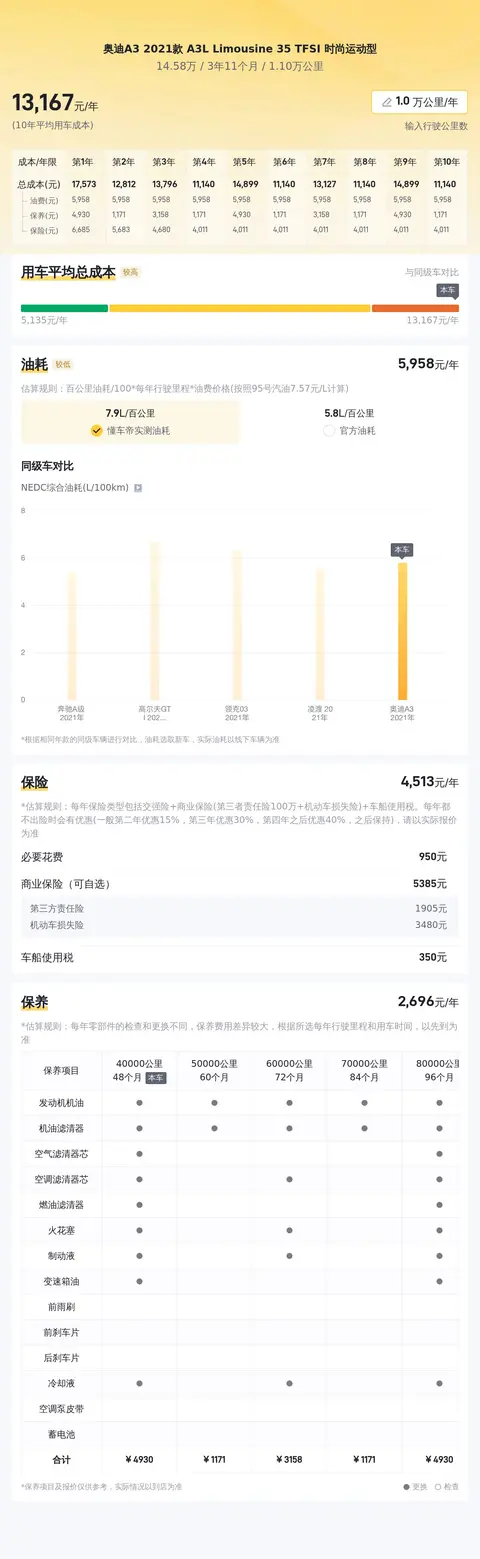 经过分析和计算,我们得出奥迪A3 2021款 A3L Limousine 35 TFSI 时尚运动型的平均百公里油耗大约为5.8升。按照每年行驶2万公里、每升汽油价格为8.08元计算,每年的油费支出约为9763元。在6年的时间里,假设油价和行驶里程保持不变,预计总共需要花费约58,578元在燃油上。除了燃油费用外,车辆保养也是用车成本中不可忽视的一部分。根据奥迪官方的保养计划和专业机构的预估,奥迪A3 2021款 A3L Limousine 35 TFSI 时尚运动型的平均每年保养费用大约为4,888元。这包括了常规保养项目如更换机油、机滤、空气滤清器等,以及可能的零部件检查和更换。在6年的用车周期中,预计总共需要花费约29,328元在车辆保养上。此外,车险费用也是每年必不可少的开支。根据多家保险公司的报价和历史数据,奥迪A3 2021款 A3L Limousine 35 TFSI 时尚运动型的第一年车险费用大约为4,988元。随着无理赔记录的积累,车险费用通常会逐年递减。在6年的时间里,预计总共需要花费约24,940元在车险上。综上所述,如果您计划购买一辆奥迪A3 2021款 A3L Limousine 35 TFSI 时尚运动型并使用6年,除了购车成本外,还需要预留约113,846元作为燃油、保养和车险等用车成本的预算。这个估算基于一定的假设和市场情况,实际费用可能会因个人驾驶习惯、车辆使用频率、油价波动、保险政策等因素而有所差异。