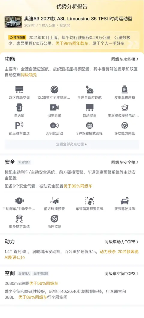 今天给大家带来一款奥迪A3 2021款 A3L Limousine 35 TFSI 时尚运动型,这款车型是奥迪A3家族中的长轴距三厢版本,35 TFSI标识着它搭载了一具1.4升涡轮增压引擎,能为你带来充沛的动力同时维持合理的燃油经济性。这车有个亮点就是“A3L”,这是奥迪针对中国市场特别推出的长轴距版本,车内空间会比标准版来的更宽敞,特别是后排乘客的腿部空间。至于时尚运动型,则是奥迪对这款车配置水平的描述,既注重日常使用的舒适与便利,也透露出一丝运动气息。这款车在市场上的评价还算不错,不过跟其他奥迪车型相比,它偶尔还是会有些小毛病,比如内饰材料可能没那么高档,车辆的隔音效果也可能还有提升空间。但总体来看,如果价格合适,比如像今天要说的这辆只要14.58万的A3,还是挺值得考虑的,能以合理的价格享受到奥迪品牌的品质和科技,平时用起来也比较省心。