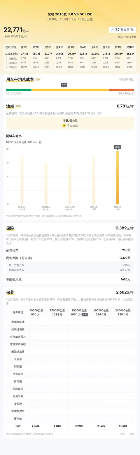 根据懂车帝官方大数据分析,这辆发现 2015款 3.0 V6 SC HSE的10年平均用车成本大约是23173元/年,与同级别车型相比它的用车成本适中。具体的实际费用开销视车主的用车情况而有所不同。