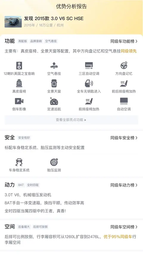 这辆发现 2015款 3.0 V6 SC HSE在动力性能、内饰设计、舒适性和安全性等方面都表现出色。然而,作为一款豪华品牌车型,它的保养费用相对较高。此外,它已经过户了8次,潜在买家需要特别关注车辆的实际状况,确保没有重大事故或维修问题。