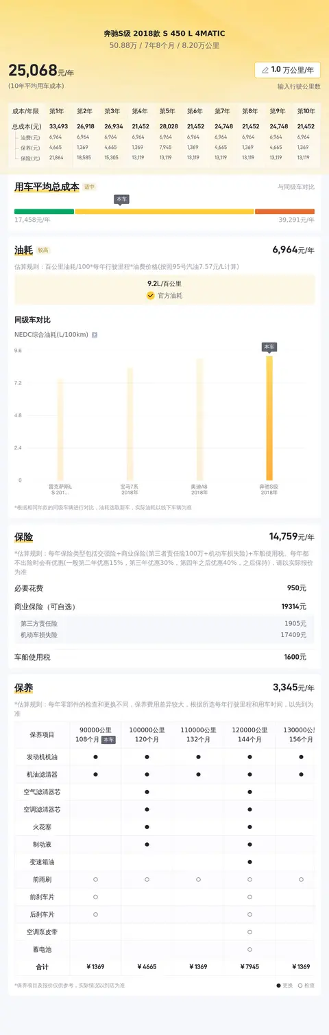 另外,同级车的最低10年平均用车成本是18593元/年,最高是46760元/年,奔驰S级 2018款 S 450 L 4MATIC是25177元/年,用车成本适中,不占优势。