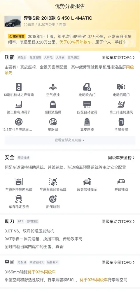 这辆奔驰S级 2018款 S 450 L 4MATIC的优势非常明显,首先这台车的里程只有8.2万公里,对于豪华车来说,如此低的里程数是非常少见的。其次这台车的售价比较合理,仅仅50.88万就能体验旗舰车型的豪华和舒适,性价比这块拿捏的死死的。