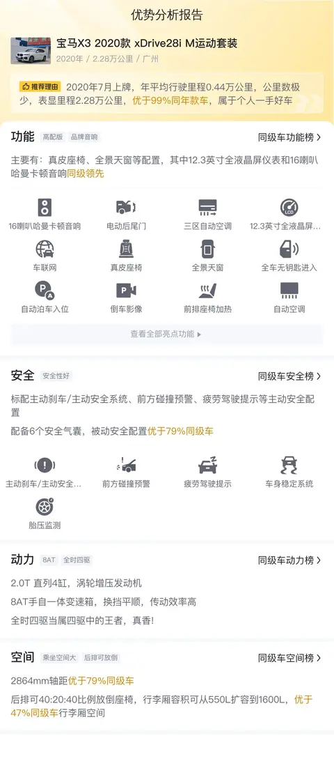 据估算,同级车的最低用车成本是14178元/年,最高是18671元/年,宝马X3 2020款 xDrive28i M运动套装是16133元/年,用车成本适中。
