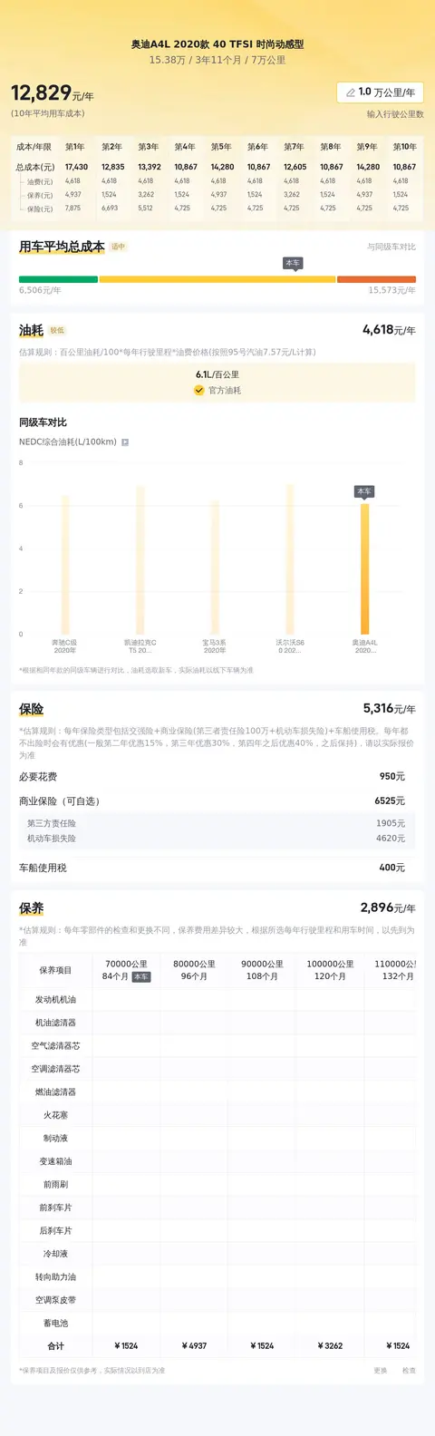 接着来说一下这辆车的使用成本。根据估算,这辆奥迪A4L的年均综合用车成本约为1.3万元。这里值得一说的是,实际费用根据车主的使用习惯和维护程度可能会有所不同,但该估算为您提供了一个合理的预期范围。