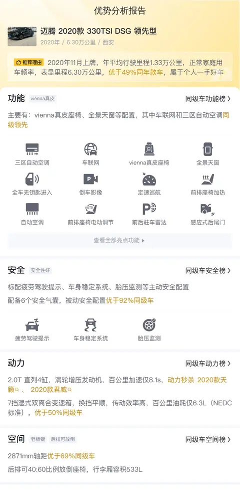 接下来,让我们聚焦今天的主角——一辆二手迈腾,具体版本为2020款330TSI DSG领先型。这款车已行驶6.3万公里,上牌时间为2020年11月,车牌所在地和车辆所在地均为西安,车身颜色为黑色,尚未有过过户记录。新车指导价为21.99万元,而现在的二手市场报价为10.68万元,这一价格相较于新车价格具有明显的性价比优势。对于寻求高性价比和稳定用车体验的消费者来说,这辆二手迈腾无疑是一个值得考虑的选择。