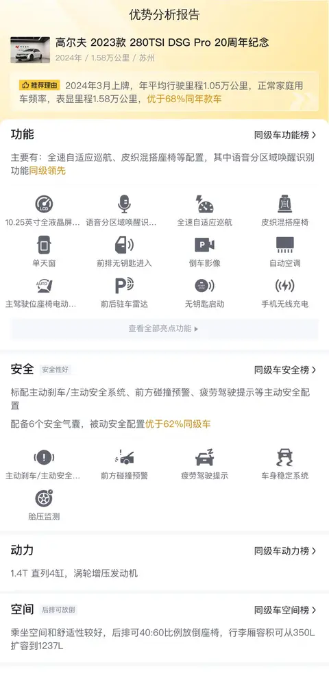 综上所述,高尔夫 2023款 280TSI DSG Pro 20周年纪念作为一款日常使用的家用轿车,凭借其良好的动力性能、操控稳定性以及较高的性价比,是一款值得考虑的车型。然而,如果您更加注重豪华感、科技配置或后排空间,可能需要将目光投向奥迪A3、奔驰A级或宝马1系等豪华品牌车型。在做出购买决策之前,建议您根据自己的需求和预算,进行充分的比较和试驾,以选择最适合自己的车型。