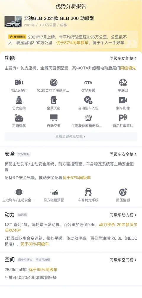 这辆二手奔驰GLB 2021款 GLB 200 动感型,上牌地车源地均在四川成都,上牌时间为2021年7月,表显里程3.9万公里,白色车身深色内饰,新车指导价31.88万,现一口价15.58万,至今过户0次。