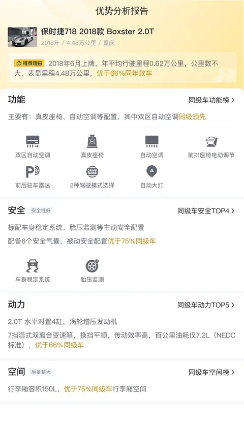 在配置部分,这辆保时捷718配备有真皮座椅、自动空调等配置,其中双区自动空调同级领先。值得一提的是,这辆车的座椅舒适性较好,支持电动调节和加热,长途驾驶也比较舒服。在安全性配置上,这辆车配备有车身稳定系统、胎压监测等主动安全配置,配备的6个安全气囊,被动安全配置优于86%同级车。