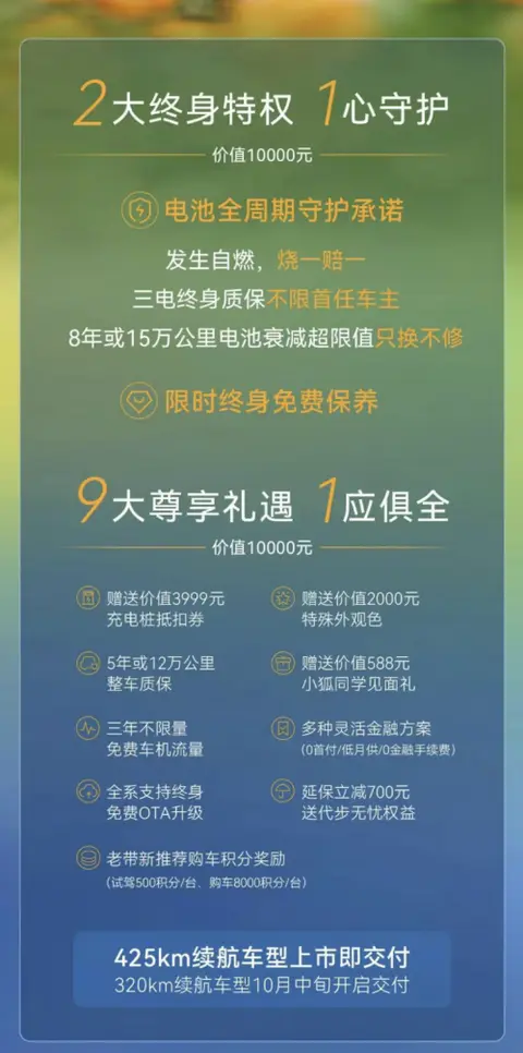 最后不得不提极狐T1的购车权益,诚意直接拉满。2大终身特权1心守护价值10000元,包括电池全周期守护承诺(发生自燃,一赔一)、三电终身质保不限首任车主、8年或15万公里电池衰减超限值只换不修,还有限时终身免费保养(得在10.31前下定才能享受)。9大尊享礼遇也价值10000元,像赠送3999元充电桩抵扣券、2000元特殊外观色、588元“小狐同学”见面礼,还有5年/12万公里整车质保、三年不限量免费车机流量等。交付也快,425km续航车型上市即交付,320km续航车型10月中旬开启交付,想入手的朋友不用等太久。