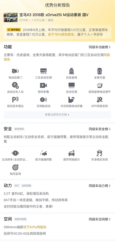 先跟大家说一下这辆车的基本信息,该车的具体版本是——宝马X3 2018款 xDrive25i M运动套装,首次上牌时间为2018年9月,车源地和上牌地都是襄阳,期间过户0次。截至目前,该车表显里程7.1万公里,符合国V排放标准。车身颜色为白色,采用汽油驱动,配备四驱功能。
