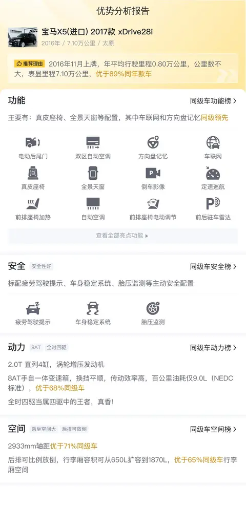 与同级别车型相比,宝马X5(进口) 2017款 xDrive28i 在配置和性能方面均表现出色。其独特的卖点包括智能全轮驱动系统和豪华内饰设计,使它在二手市场中更具竞争力。