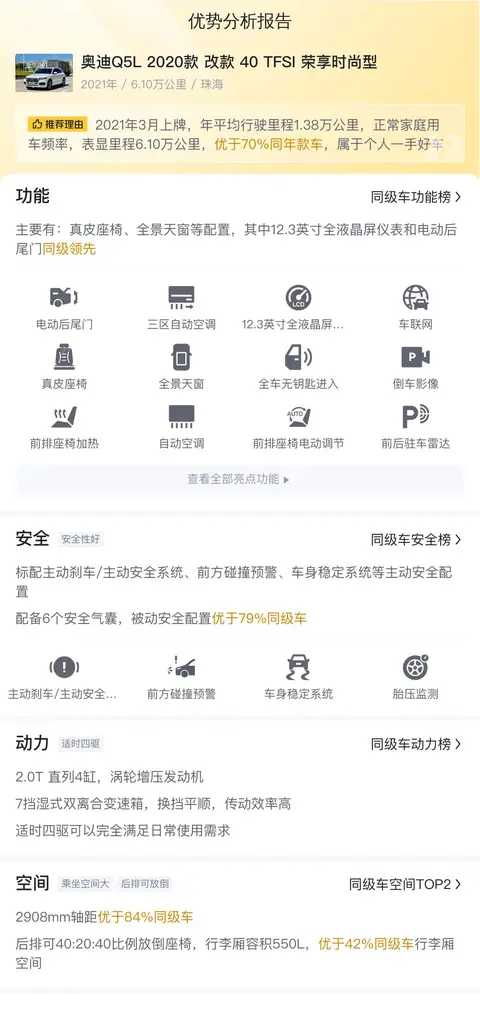 综上所述,奥迪Q5L 2020款改款40 TFSI 荣享时尚型以其卓越的性能、宽敞的空间、豪华的内饰以及丰富的配置,成为了众多消费者心中的理想之选。而其在二手车市场上的出色表现,更让其成为了一款值得信赖的高品质车型。如果您正在寻找一款性能卓越、品质可靠的中型豪华SUV,那么奥迪Q5L 2020款改款40 TFSI 荣享时尚型绝对是一个值得考虑的选择。
