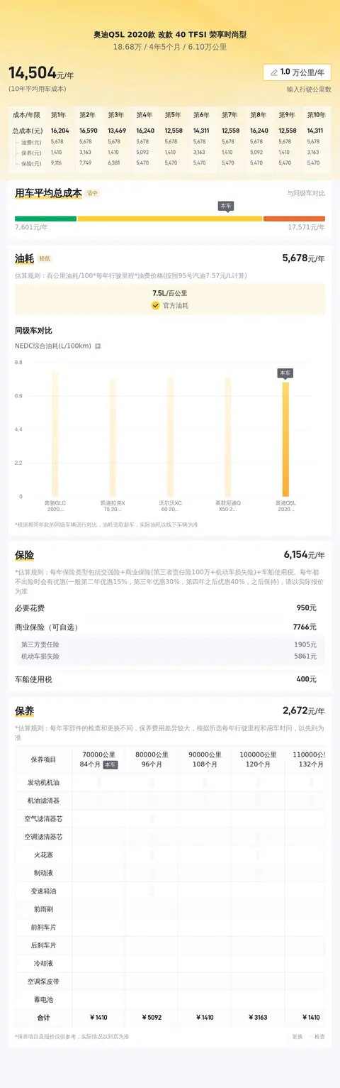 接下来,就让我们一起来了解一下这款二手奥迪Q5L 2020款改款40 TFSI荣享时尚型的基本情况吧!该车定位中型SUV,车身颜色为白色,行驶里程6.10万公里,个人一手车。车辆首次上牌时间为2021年3月,车牌所在地和车辆所在地均为珠海,符合国VI排放标准。目前该车的售价为18.68万,相较于新车指导价41.58万,便宜了22.9万。按每年行驶一万公里计算,这辆车十年的使用成本大约为15415元/年。
