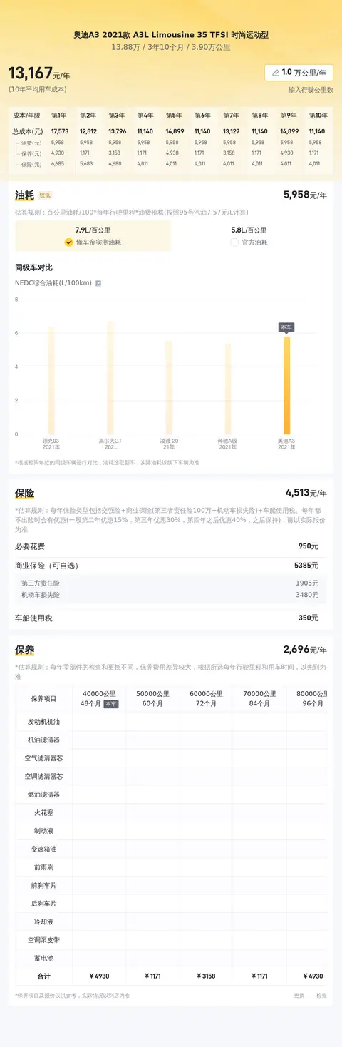根据懂车帝的数据,这辆奥迪A3 2021款 A3L Limousine 35 TFSI 时尚运动型的售价为13.88万,符合市场行情,是一个不错的选择。同时,它的保值率也相对较高,预计再行驶2年后仍能卖出好价钱。根据估算,这辆车年均综合用车成本大概在每年1.3万元左右,实际费用根据车主的使用情况而有所不同。