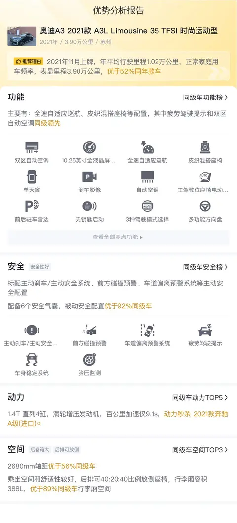这辆奥迪A3 2021款 A3L Limousine 35 TFSI 时尚运动型配置丰富,包括全速自适应巡航、皮织混搭座椅、疲劳驾驶提示、双区自动空调等配置,其中疲劳驾驶提示和双区自动空调同级领先。官方百公里加速时间为9.1秒,动力强劲。1.4T 直列4缸,涡轮增压发动机,百公里加速仅9.1s,动力秒杀2021款奔驰A级(进口)。轴距2680mm,提供宽敞舒适的乘坐空间和行李厢容积388L,优于89%同级车行李厢空间。