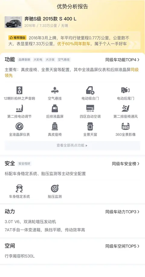 在二手车市场上,奔驰S级 2015款 S 400 L的市场行情价是32.67万-40.67万,它的报价则是32.88万,报价较低,有优势,同时保值率也高。