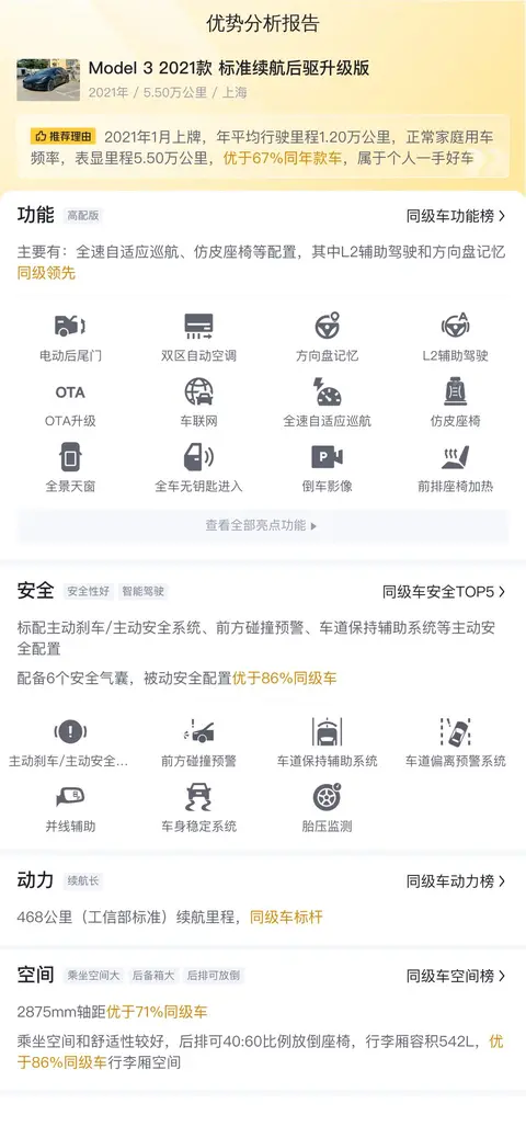 综上所述,这辆二手Model 3 2021款 标准续航后驱升级版在价格、配置、性能等方面都表现不俗。然而,需要注意的是,该车目前未提供检测报告,潜在买家在做出购买决策之前,建议务必向卖家索取正规的第三方检测报告,以便更全面、准确地了解车辆的实际状况。尽管如此,这辆车仍然以其合理的价格、丰富的配置和出色的性能,成为了一款值得考虑的二手电动轿车选择。