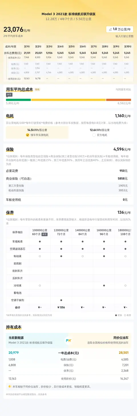 接下来,我们来聊聊大家可能都比较关心的一个点——用车成本。根据相关数据显示,这辆二手Model 3 2021款 标准续航后驱升级版的年均综合用车成本大约为2.3万元左右。需要注意的是,这项费用并不包括保险和保养等额外支出。至于电费方面,按照百公里电耗为12.6kWh计算,每百公里的电费大约为6元(假设电费为0.5元/kWh)。当然,这项费用可能会根据实际使用情况和电费价格的波动而有所变化。
