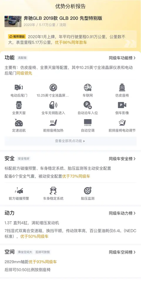 不过,据估算它的用车成本不占优势,因为同级车的最低用车成本是5778元/年,最高是16478元/年,奔驰GLB 2019款 GLB 200 先型特别版是13681元/年。