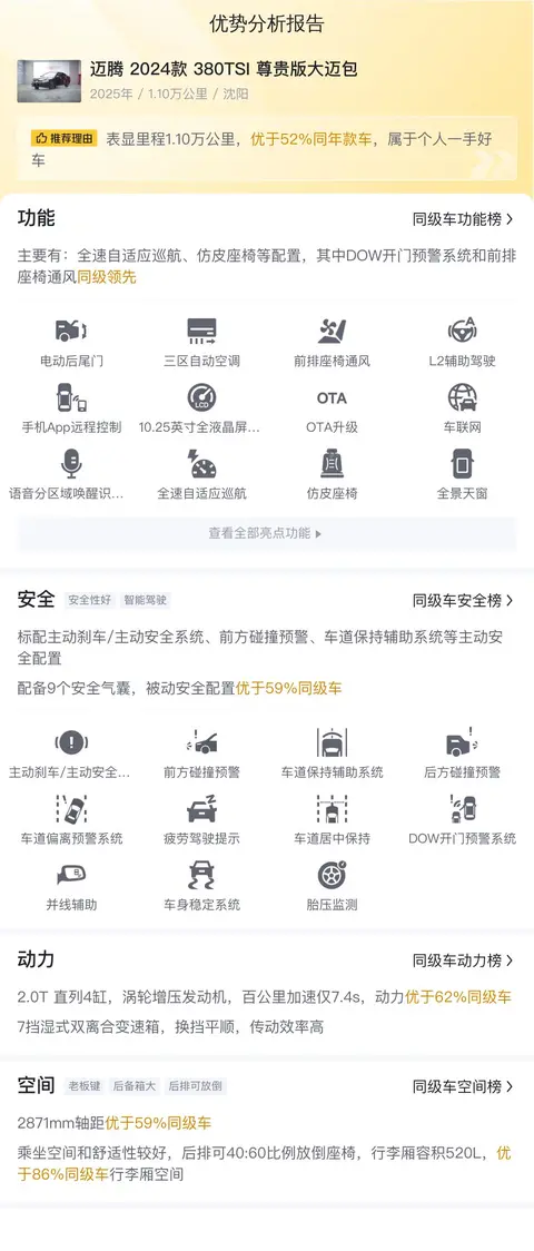 该车的优势在于其丰富的配置、强大的动力以及宽敞的空间,尤其是其全速自适应巡航和前排座椅通风功能,同级领先。而缺点则在于保值率并不是太高,以及后期保养费用较高。