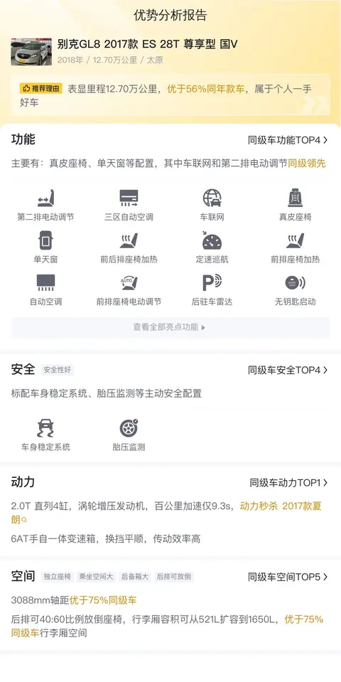 优势:作为早期MPV的代表,别克GL8的知名度尚可,保值率有一定保障。空间大,适合全家出行。MPV可以很好的适用全家出行,空间大,座椅多,比较受家庭用车欢迎。配置丰富,舒适性高。价格相对来说不高,性价比不错。